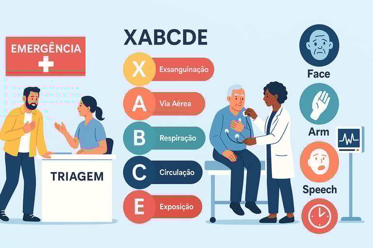 Diversos cenários podem ocorrer dentro de um pronto-socorro. Um paciente com dor no peito súbita e intensa, por exemplo, pode estar sofrendo um infarto e precisa ser rapidamente conectado ao monitor cardíaco, receber oxigênio, ter exames coletados e, em muitos casos, ser levado à sala de hemodinâmica para desobstrução da artéria. Já um idoso que chega com dificuldade de fala e perda de força em um lado do corpo pode estar em um Acidente Vascular Cerebral (AVC), situação em que cada minuto conta. Nesses casos, o protocolo “time is brain” é aplicado, direcionando o paciente rapidamente para tomografia e possível trombólise. Outro exemplo é o de vítimas de acidente de trânsito com múltiplos traumas, onde a equipe multiprofissional atua em conjunto utilizando protocolos de trauma e exames rápidos como o FAST, que avalia sangramentos internos.